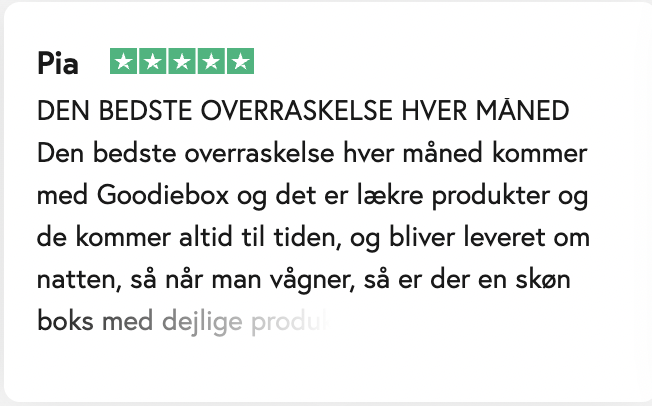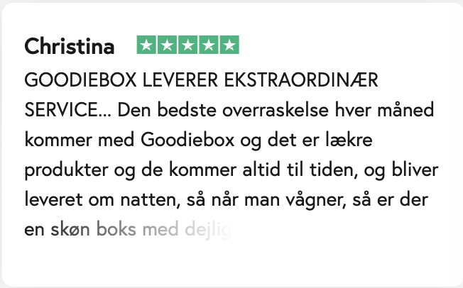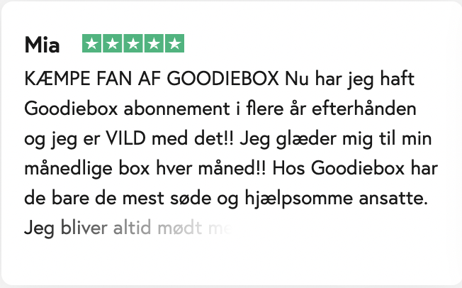 Goodiebox koster 199 kr. pr. måned, inklusiv fragt og håndtering. Denne pris dækker altså alt – ingen skjulte gebyrer her! Prisen er desuden den samme, uanset om du vælger at få din Goodiebox leveret med DAO eller Bring.